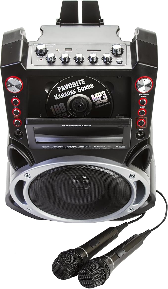 Karaoke USA GF845 Complete Karaoke System with 2 Microphones, Remote Control, 7” Color Display, LED Lights - Works with DVD, Bluetooth, CD, MP3 and All Devices