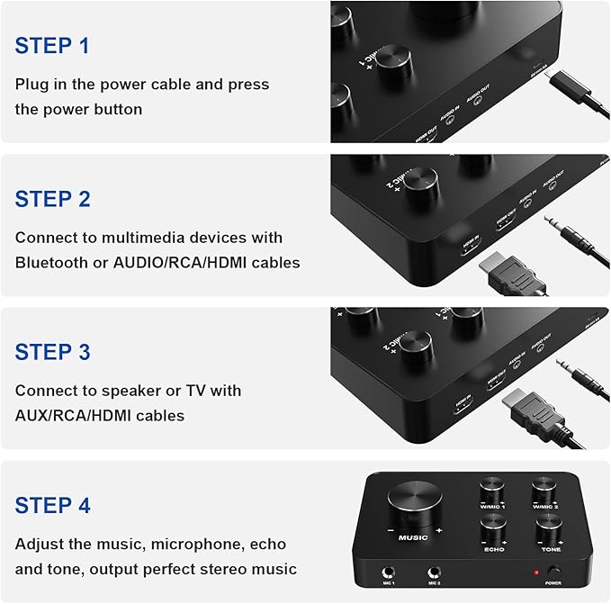 - šµćClear and Pristine Sound QualityćThe receiver has 5 rotatable dials to quickly adjust the volume of music, mic, echo and tone to your desired level. You can set different parameters by yourself to reflect your specific style and output clear robust optimal true sound.
