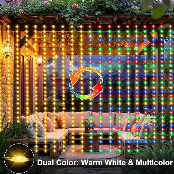 - 2 Color Changing Curtain Lights: 20ft (W) X 10ft (H). 600 LED Large curtain lights can be switched to Warm white & Multicolor. Perfect Indoor outdoor fairy curtain lights for wedding, bedroom wall, window, patio, garden, Christmas decor