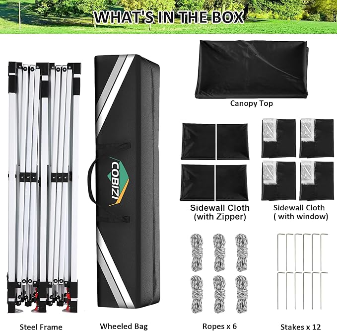- 【Packing List】COBIZI 10x20 pop up canopy includes a 10x20 canopy frame x 1, canopy 10x20 cover x 1, sidewalls with windows x 4, sidewalls with zippers x 2, sandbags x 4, ropes x 6, canopy stakes x 12, and carrying bag x 1. 10x20 pop up tent is not meant to be a permanent structure(Heavy rain and strong winds can accumulate on the roof, causing leaks or damage. Please contact us for assistance with any after-sales issues