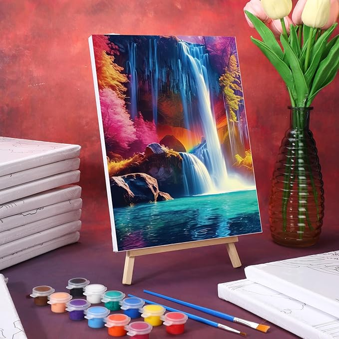 - Package Include: pre printed canvas for painting package includes 12 pre painted canvases, 12 paints in12 colors, 12 flat pen, 12 pointed pen, 12 palettes in 6 colors, 12 wooden easels; Whether you have a party or just want to relax and paint, canvas with pictures to paint has got you covered; Note: The paint set is placed in the back of the board