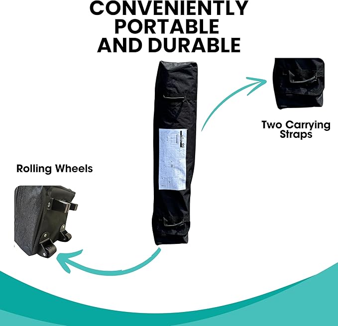 - Flame retardant and Easy strorage Portability with Rolling Storage Bag: Frame folds down in seconds using One Touch. so you can Slide it into the included wheeled roller storage bag and take it anywhere to use or store it. Transport with the Zip-up Portable carrying case comes with two rugged rubber handles & buckle straps for team lift or wheels for roll away alone for your convenience and protection of your canopy. Avoid using in heavy rainy days or extreme weather to extend the service life
