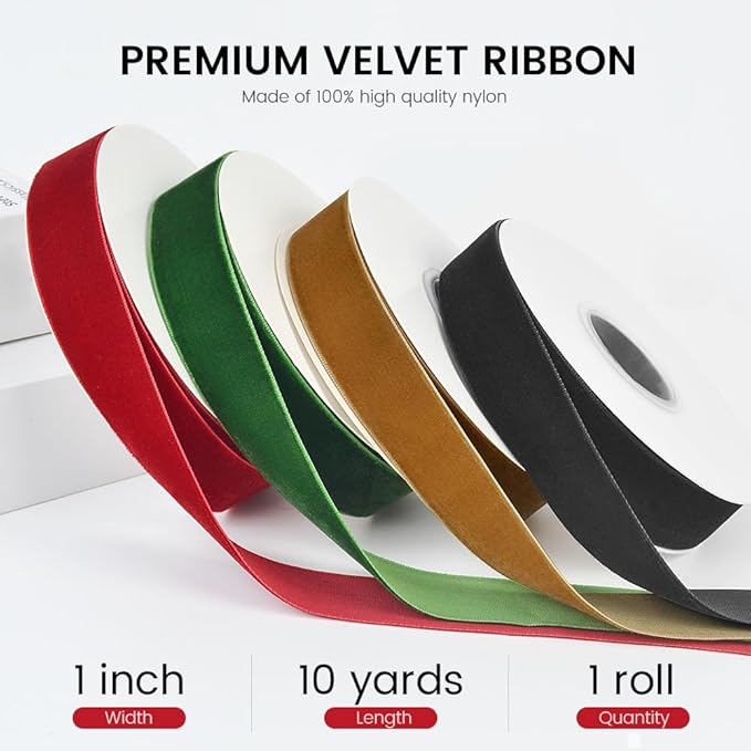 - 【Widely Application】Vintage velvet ribbon size: 1 inches wide x 10 yards each roll, which is perfect for craft, gift wrapping, DIY bows, Christmas decoration, wedding invitations card, wedding decoration, hotel decoration, party decoration.