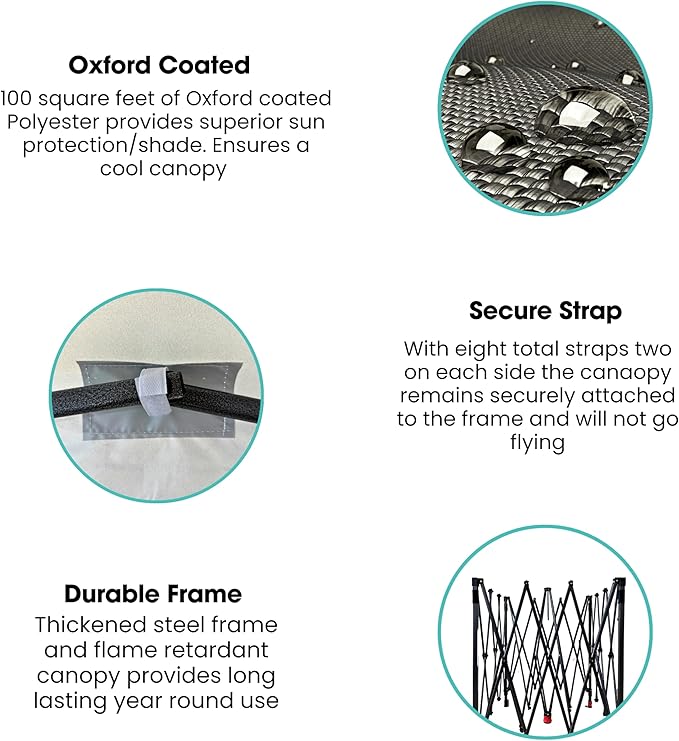 - Pre-Assembled Thick Rustproof, Wind Resistance Frame made of high-strength alloy steel hammered powder coating. Metal legs 28x28mm, top bars 12x22mm to prevent rust, chipping, peeling & corrosion. Heavy-duty reinforced PE corner joints for long-lasting quality year-round. Feet with 3 drilled holes for ground stakes. Water-resistant, High Density Oxford Polyester Fabric 1000mm with silver coating, CPAI-84 Rated Flame Resistant, UPF 50+ Superior UV Protection to block 99% of harmful sunlight rays