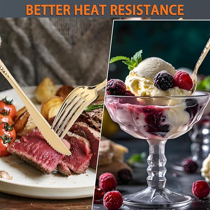 - HEAVY DUTY AND DURABLE PLASTIC:Crafted from premium, heavy-duty plastic, this gold utensils set disposable is designed to withstand even the most demanding events. The forks spoons and knives set is durable, ensuring they won't bend or break during use. BPA-free and made from food-safe materials, this disposable silverware offers both safety and strength.
