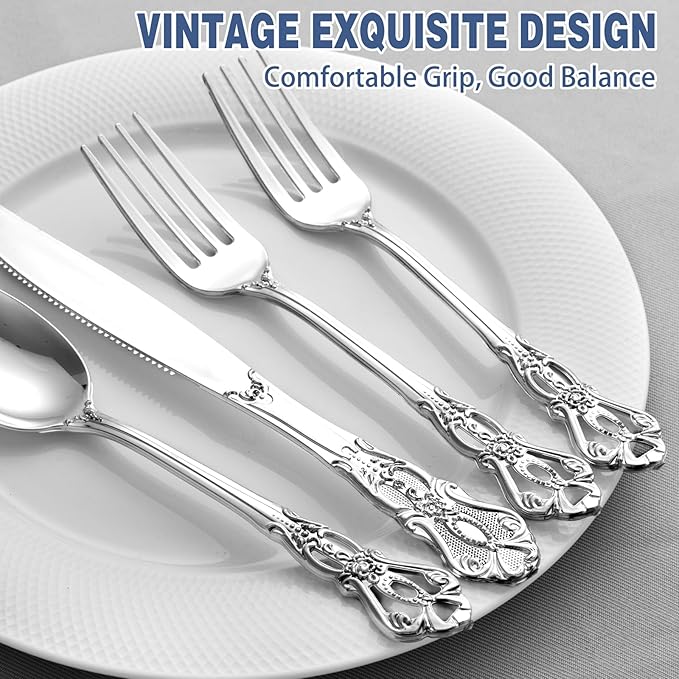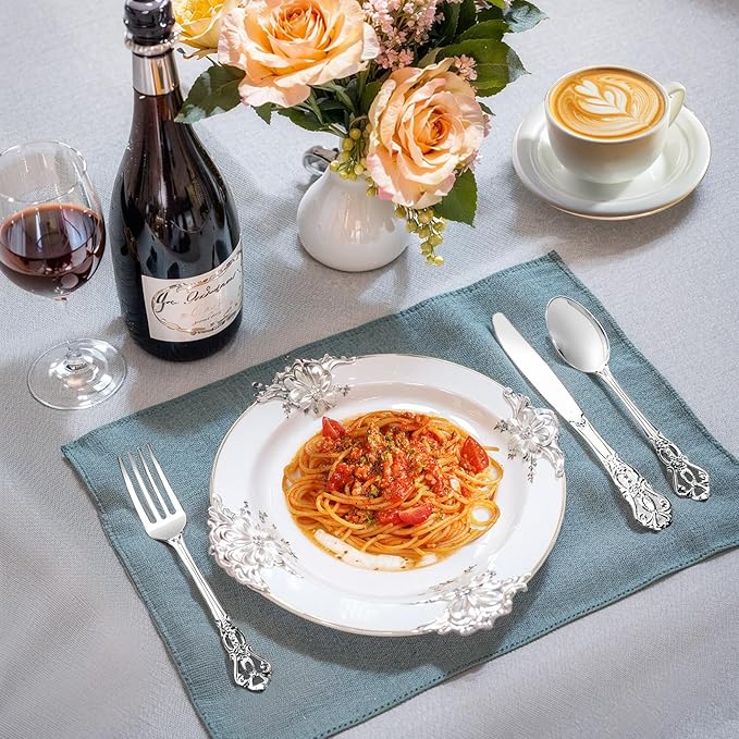 - Classic and Elegant Design:The silver plastic silverware adopts Baroque style and retro hollow pattern design. Plastic forks and spoons with a glossy surface and smooth hand feel. The material is 100% BPA Free design, sturdy and easy to bend. It can immerse your guests in a luxurious atmosphere.
