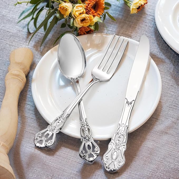 - Suitable for All Occasions:You can use this silver plastic utensils in any occasions. Classic design whether it is a catering,banquet,party,or business meeting, including all formal and informal events. Such as anniversaries, tea parties, wine tastings, wedding receptions, engagement and graduation parties, fancy restaurants, big lunches, etc.
