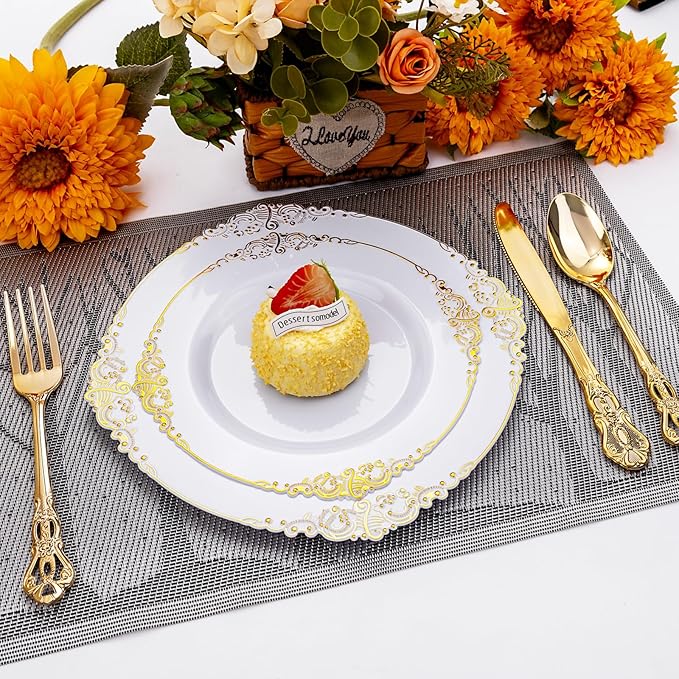 - Fancy and Elegant Design:The gold plastic silverware adopts Baroque style and retro hollow pattern design. Our heavy duty gold disposable utensils won’t bend easily. You don't have to worry about breaking in the process of using the gold plastic cutlery set.