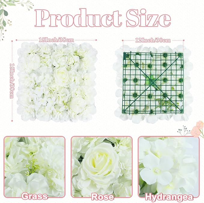- ★【Package and Size - Flower Wall Backdrop】Each box includes 12 enchanting white flower wall backdrop, each measuring 15” L × 15” W, as well as 100pcs cable zip ties, 1pc hot melt glue, 12 pcs wall hooks. Artificial flower wall panels boasts refined textures and lifelike color and infusing every corner with a romantic charm.