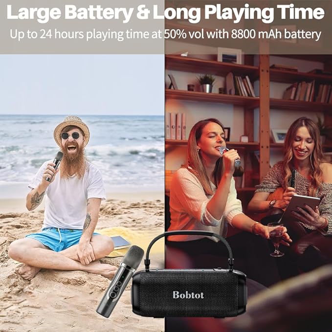 - Easy to carry: 8800 mAh battery allows this speaker with microphone to play about 20 hours so no worries if you bring it for outdoor activities. Playing time also varies from the volume and music type. With the rubber on the strap, it would be nice to grab it or hang it somewhere.