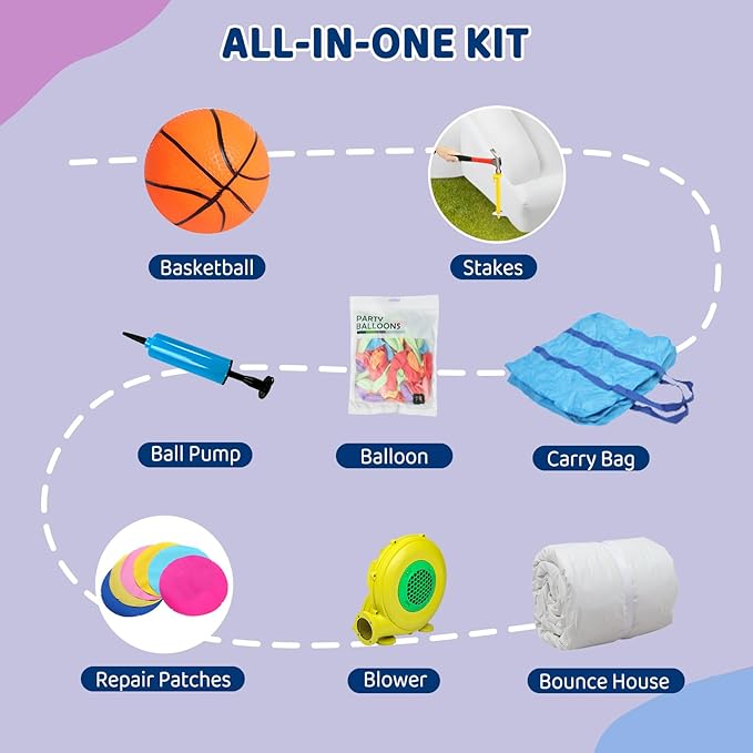 - 【All in One Kit】 The package of the bouncer includes a powerful air blower for 30s quick inflation. Additionally, a pack of colored balloons is attached to further create a party atmosphere. The bounce house with slide combo also includes carrying bag, stakes, basketball, ball pump.