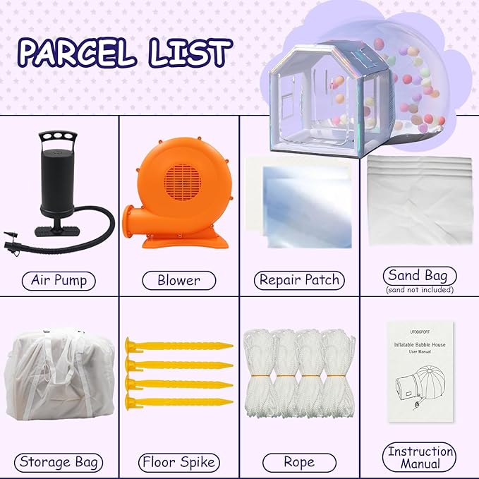 - 【PACKAGE & STORE】Our package includes 1 x inflatable bubble house, 1 x blower, 1 x Manual air pump, 1 x Repair kit,1 x Storage bag. The inflatable bubble tent can be deflated and folded up for easy storage without taking up too much space. Meanwhile, the lightweight material makes it easy for you to take it wherever you need it