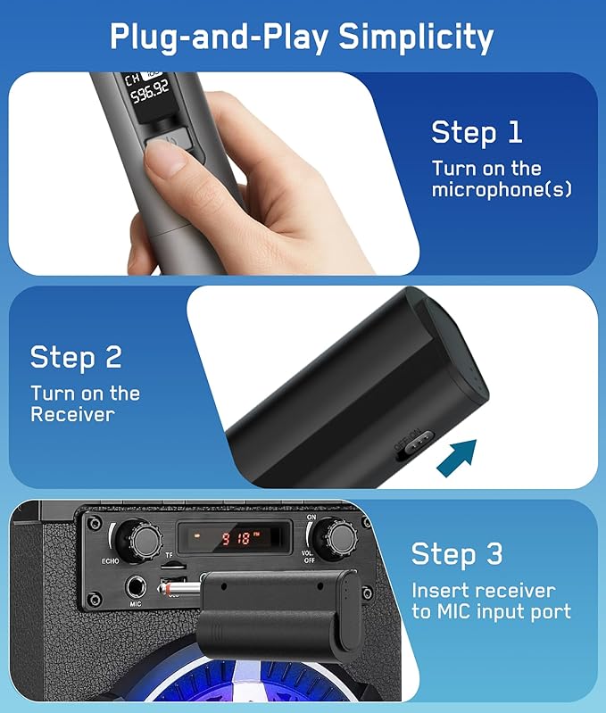 - 【Plug-and-Play Simplicity】Simply plug the 1/4" receiver into your sound system, and you're ready to go! No complicated setup or adjustments required—ideal for quick performances and events.