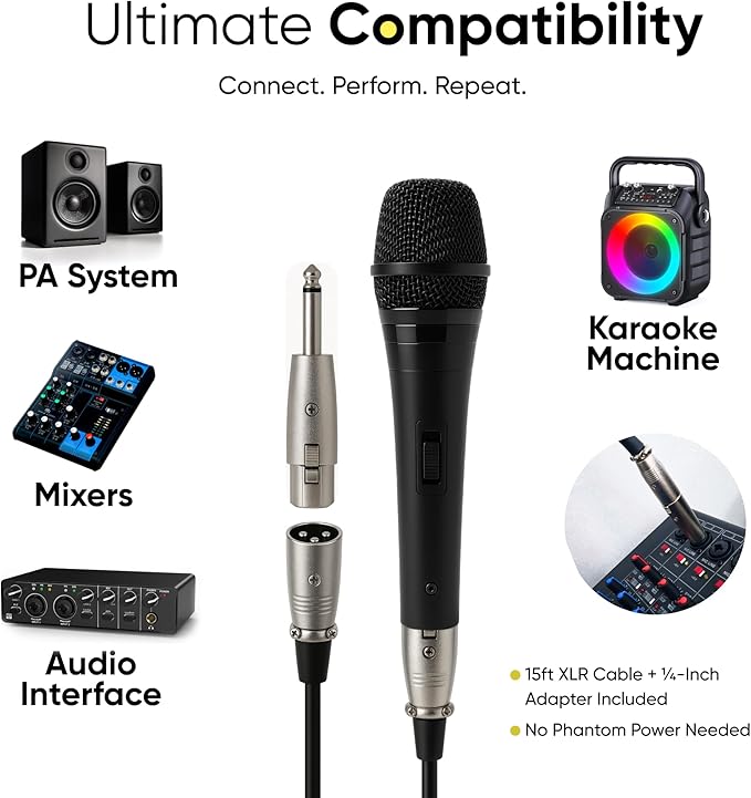- Extended Reach with XLR Cables – Stay Connected & Mobile Equipped with two 15ft XLR cables and 1/4-inch adapters, this setup gives performers the freedom to move comfortably while staying connected—no dropouts, no limitations. Compatible with karaoke machines, PA systems, and mixers.