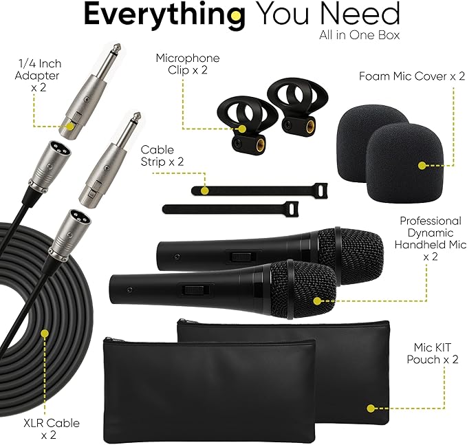 - Complete Dual Set – Be Ready for Any Setup Each bundle includes 2 microphones, 2 XLR cables, 2 foam covers, 2 clips, 2 cable ties, and a carrying pouch—ideal for karaoke partners, music duos, wedding DJs, or recording studios needing reliable gear, times two.