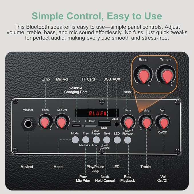 - Easy Use with Bass & Treble Adjustment: This Bluetooth speaker with bass and treble control is incredibly easy to use—no complex setup required. The front panel includes clearly labeled knobs, allowing anyone to fine-tune the sound to their liking in seconds. Whether you want more bass for dance tracks or sharper treble for vocals, the intuitive design makes adjustments effortless—even for first-time users. Ideal for all ages, this is a truly user-friendly karaoke speaker.