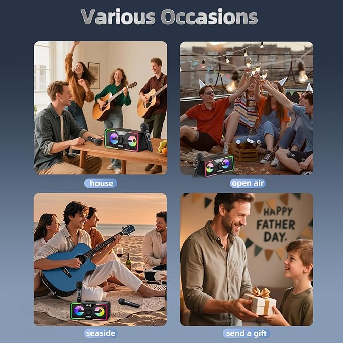 - Immersive Sound for Any Occasion: Equipped with dual 4-inch powerful speakers and rechargeable wireless microphones, delivers crystal-clear vocals, rich bass, and a truly immersive audio experience; perfect for home gatherings, birthdays, and outdoor parties