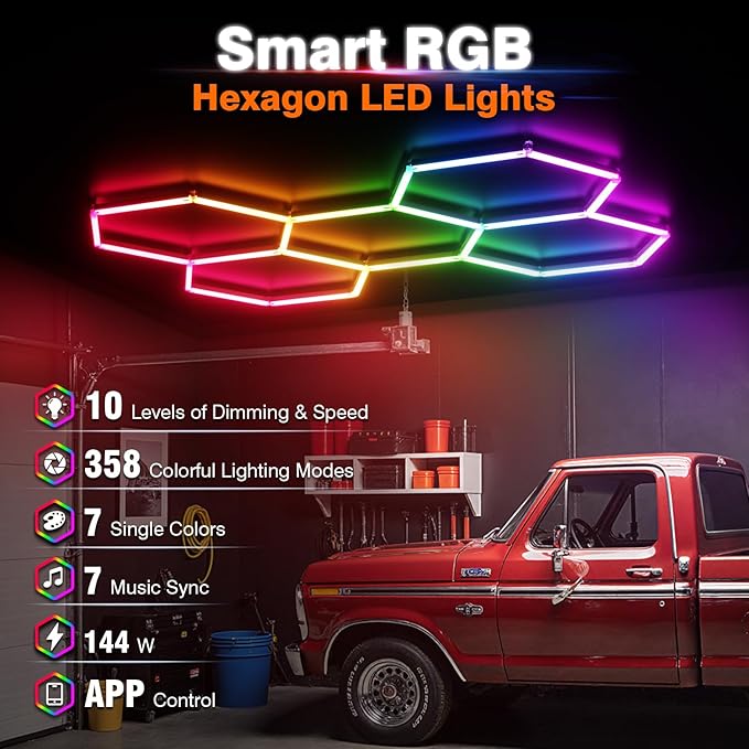- Immersive RGB Hexagon Garage Lights – Transform your garage, gaming setup, or studio with modular LED hexagon lights. Brilliant RGB colors with ultra-smooth gradients turn any wall or ceiling into a futuristic honeycomb lighting design