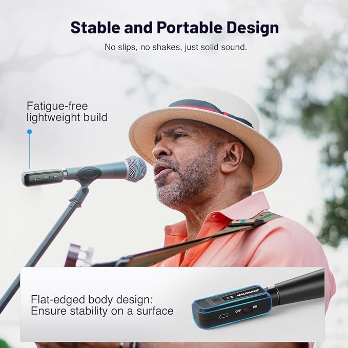 - STABLE & RELIABLE DESIGN: This Plug-on XLR wireless adapter features a lightweight design that reduces hand fatigue during extended use. Its flat-edged body prevents rolling and offers added stability on flat surfaces. Additionally, a reinforced connector ensures a tight, secure fit with your wired microphone—minimizing unwanted movement and preventing noise from loose connections or vibrations. Even during high-energy stage performances, your audio stays clean, consistent, and uninterrupted