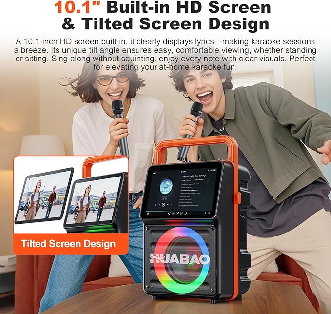 Karaoke Machine with 10.1” Built-in Screen, Bluetooth Speaker with Lyrics Display, Wireless Screen Mirroring for iOS & Android, PA System with Lights, 2 Rechargeable Mics, 5400mAh, Perfect for Parties