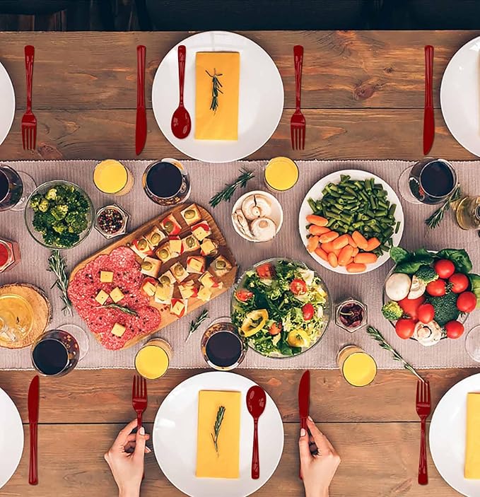 - Plastic silverware set: The disposable silverware is made of high-quality plastic that are not easy to break. The burgundy disposable cutlery add a touch of beauty to the any dining environment, whether hosting a casual gathering or a formal dinner party