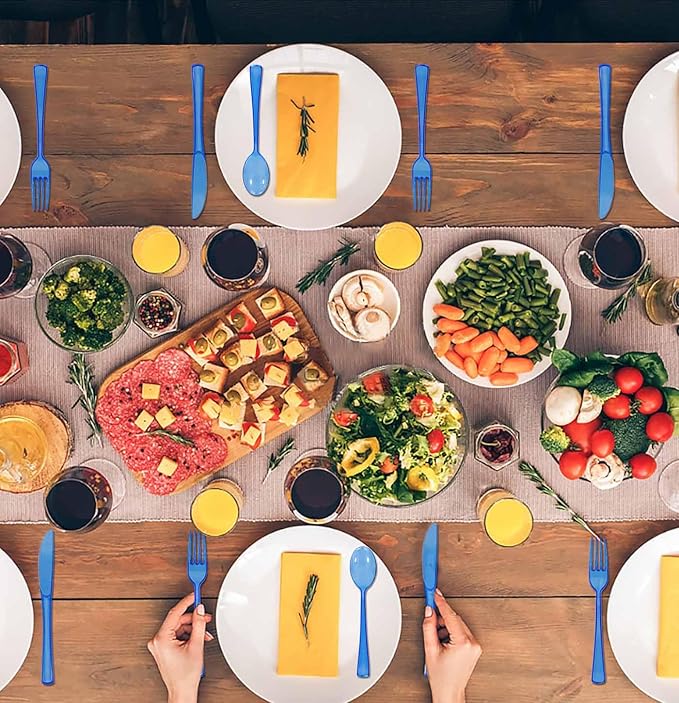 - Royal blue plastic cutlery set: The blue clear disposable cutlery set is more visually appealing, which adding a touch of elegance and advanced, can add charm to your dining table for party. The royal blue clear silverware is suitable for parties or events