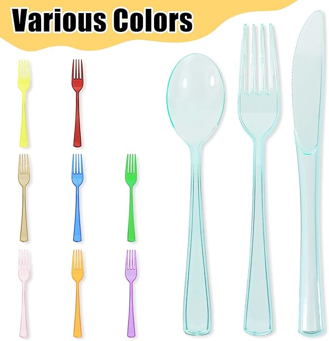 - Green cutlery set disposable: The green clear plastic utensil set can be thrown away directly after use, saving you more time and energy so that you can enjoy the fun of the holiday party. Note: Not suitable for dishwasher, microwave, or oven use