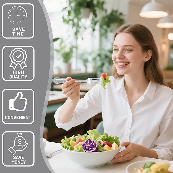 - Luxury & Elegant for Every Occasion: Elevate your table settings with our fancy silver silverware set, designed to mimic high-end metal cutlery. The shimmering silver finish adds a touch of retro sophistication to weddings, galas, or holiday gatherings.