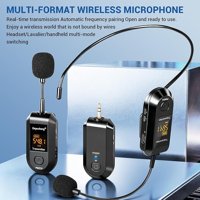 Depusheng 2.4G Wireless Microphone Headset,Lavalier and Handheld Mic 160ft Range,with 1/8''&1/4'' Plug for PA System,Voice Amplifier