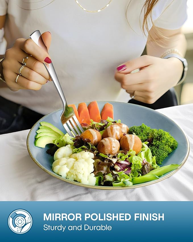 - FOOD-GRADE STAINLESS STEEL: Crafted from premium durable stainless steel with a glossy mirror finish. Our flatware set is a perfect blend of practicality and health, allowing you to enjoy your food comfortably and easily. Meanwhile, its sturdiness ensures that it will not bend in daily use, providing for long-term use