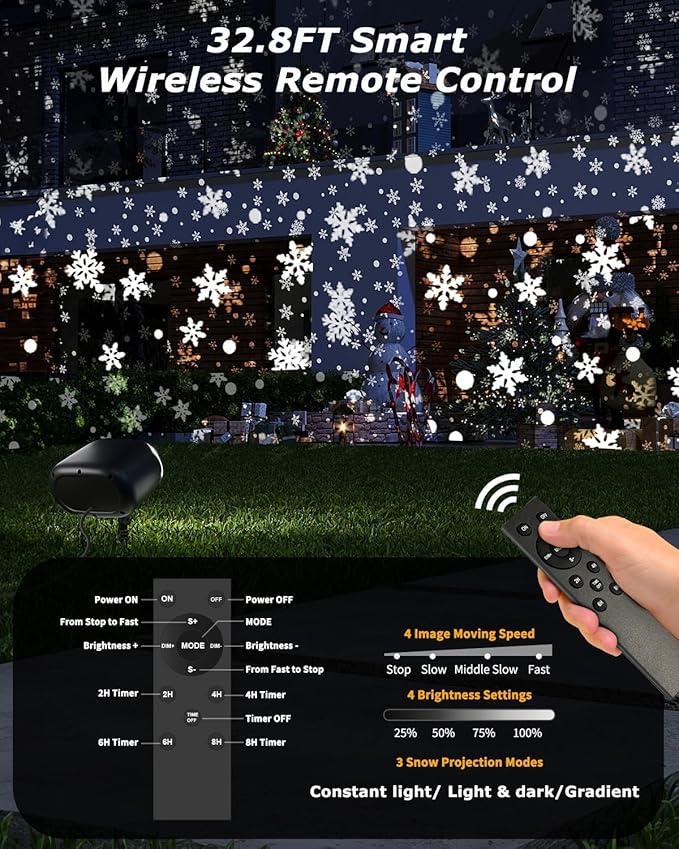 - 【4 Timer Adjust & 4 Level Speed】You can set the timer to let the christmas light projector automatically turn off after 2/4/6/8 hours, which helps save electricity! And have 4 speeds (from static to fast), freely adjust the speed of falling snowflakes according to different scenes to make the projection more like a real snow scene. *The default snowflake is fixed when the Christmas decorations lights is turned on.
