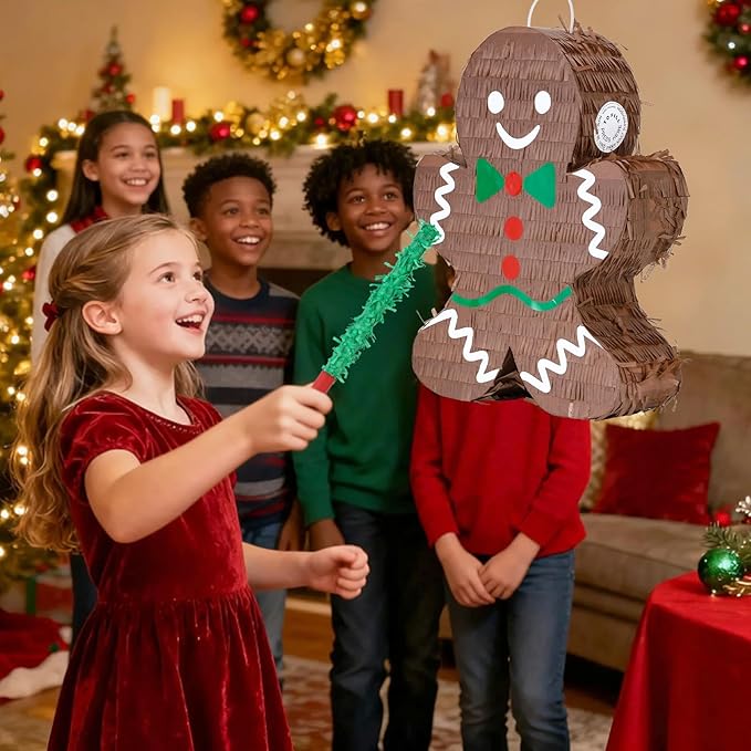 Christmas Gingerbread Man Pinatas Bundle with a Blindfold and Bat (Small Size 16.5x12.5x4 Inches), Holiday Theme Piñata, Christmas Party Supplies, Xmas Piñata, Party Decoration Games