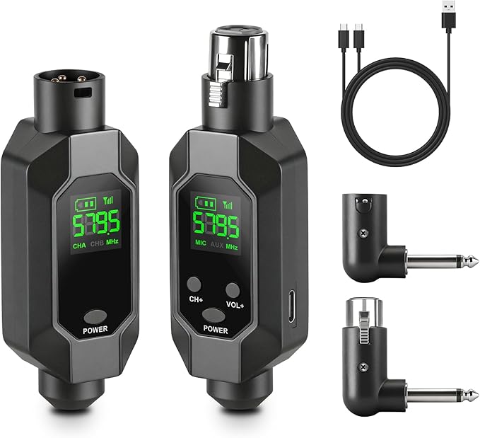 - 【What You Get】Packing List: 1x wireless XLR transmitter, 1x wireless XLR receiver, 2x XLR to 6.35plug, 1x charging Ccable, 1x user manual.If you have any questions, we will be at your service at any time.