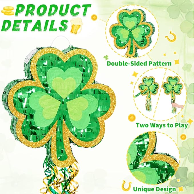 - SHAMROCK PIÑATA - Golden Shamrock Fortune! Smash this lush shamrock piñata blooming from emerald green to radiant gold, symbolizing wealth and joy bursting forth! Each strike showers you with treats and blessings—because luck isn’t just found, it’s unleashed!