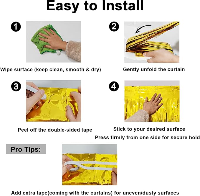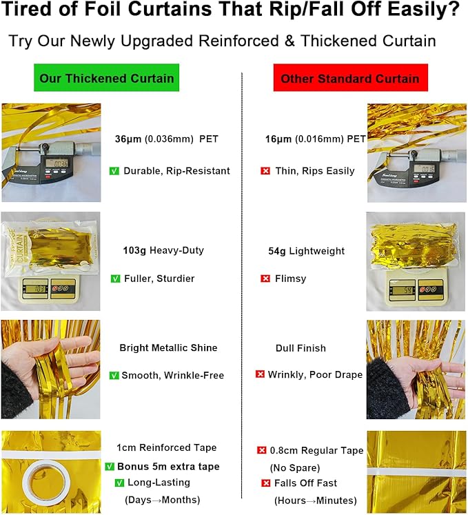 - Thicker 36μm PET Construction: Our foil fringe curtains/streamer outperform standard 16μm/23μm options: thicker, heavier (103g vs. typical 54g/75g), brighter, and smoother, with exceptional rip resistance (no more easy rips!) and a dramatic drape upgrade. Measuring 3.28ft x 6.56ft (1m x 2m), this durable, luxuriously hanging backdrop is long enough and perfect for birthdays, parties, and all celebration decor needs!