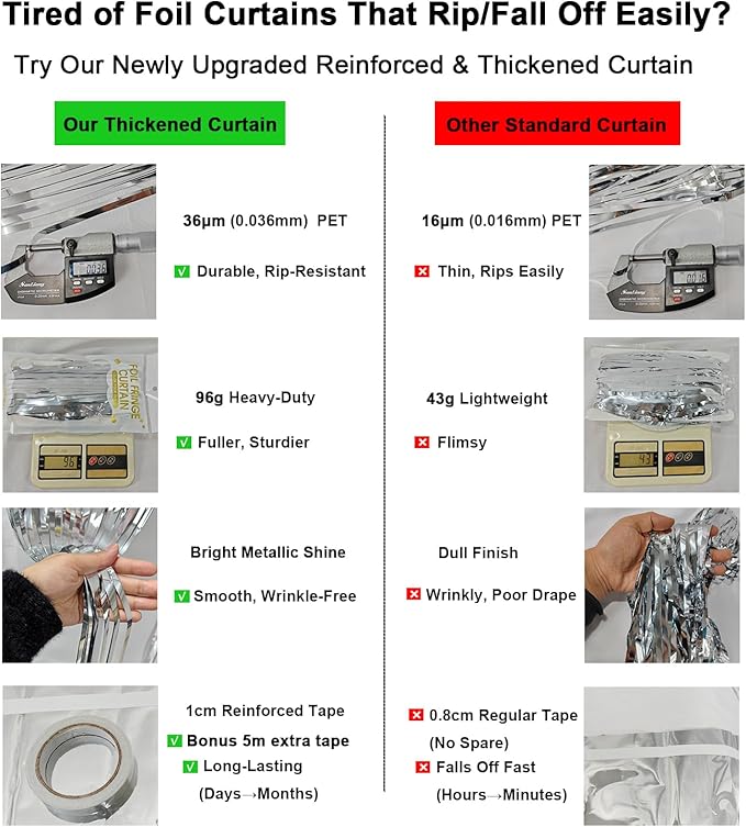 - Thicker 36μm PET Construction: Our foil fringe curtains/streamer outperform standard 16μm/23μm options: thicker, heavier (96g vs. typical 43g/65g), brighter, and smoother, with exceptional rip resistance (no more easy rips!) and a dramatic drape upgrade. Measuring 3.28ft x 6.56ft (1m x 2m), this durable, luxuriously hanging backdrop is long enough and perfect for birthdays, parties, and all celebration decor needs!