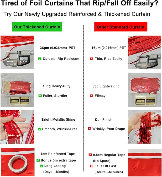 - Thicker 36μm PET Construction: Our foil fringe curtains/streamer outperform standard 16μm/23μm options: thicker, heavier (103g vs. typical 53g/75g), brighter, and smoother, with exceptional rip resistance (no more easy rips!) and a dramatic drape upgrade. Measuring 3.28ft x 6.56ft (1m x 2m), this durable, luxuriously hanging backdrop is long enough and perfect for birthdays, parties, and all celebration decor needs!