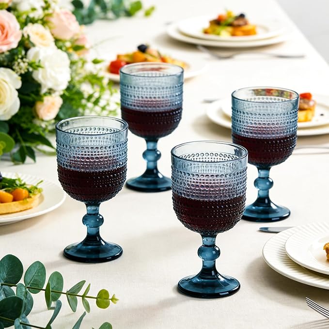 Blue Wine Glasses Set of 4, 12oz Vintage Goblet Glasses, Embossed Glass Cups Hobnail Glassware for Weddings, Dinners, and Holiday Gifting
