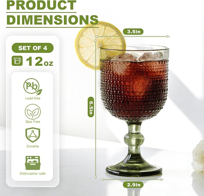 Green Wine Glasses Set of 4, 12oz Vintage Goblet Glasses, Embossed Glass Cups Hobnail Glassware for Weddings, Dinners, and Holiday Gifting