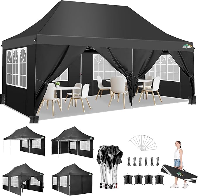 - 【Easy Setup & Versatile Usage】10x20 pop up canopy can be set up and taken down in minutes by just 2 to 4 people, without any tools required. COBIZI pop up canopy tent 10x20 is perfect for outdoor events, carports, parties, weddings, picnics, and BBQs. Simply pack the party tent into the carry bag for quick setup anywhere