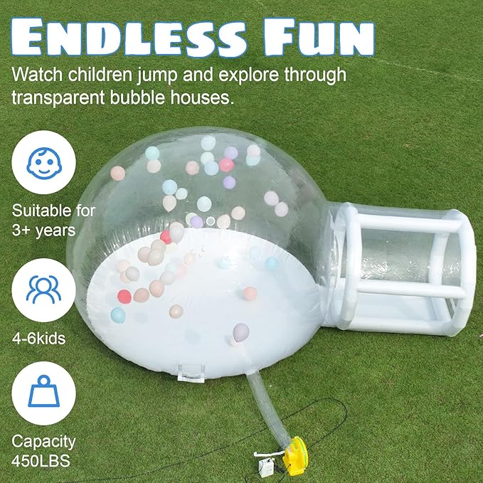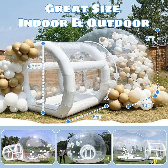 - ใ๐๐ซ๐๐๐ฆ๐ฒ ๐๐ง๐ ๐๐ง๐ญ๐๐ซ๐๐ฌ๐ญ๐ข๐ง๐ ใBubble house with a diameter of 10 feet, a height of 8 feet, and a tunnel length of 6 feet,the inflatable bubble tent can comfortably hold 4-6 people and supports up to 450 lbs.This completely transparent material is very suitable for outdoor use, such as playgrounds, backyards, lawns, etc. Parents can observe their children's play clearly through the bubble house.